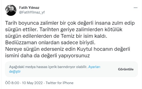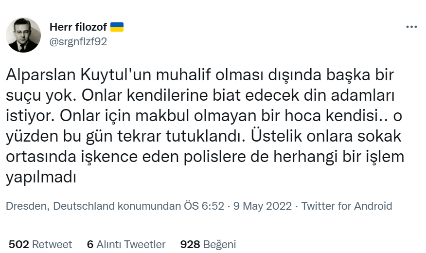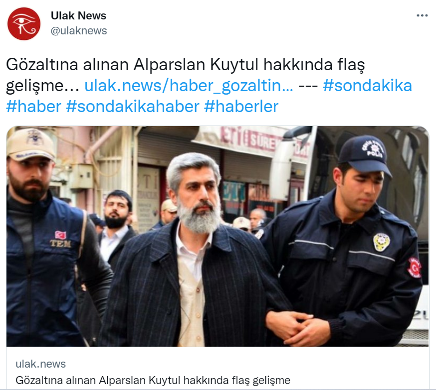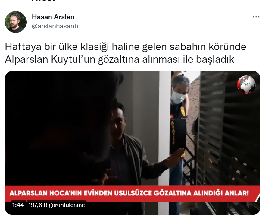 Alparslan Kuytul Hocaefendi, 9 Mayıs 2022 Pazartesi sabah 06.30 civarında haksız ve hukuksuz bir şekilde ifadesi alınmak için gözaltına alınmış, ardından tutukluluk talebiyle mahkemeye çıkarılmıştı. Onlarca masum insanı ve devleti dolandıran, polis zoruyla ifadesini değiştiren sahtekâr iş adamı Koray Sarısaçlı’nın iftira içerikli şikâyeti üzerine gözaltına alınan Alparslan Kuytul Hocaefendi haksız bir şekilde tutuklanarak Ağrı Patnos L Tipi cezaevine sürgün edildi.